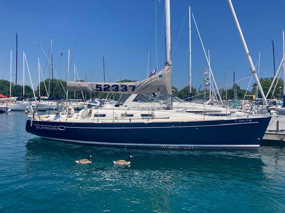 Sleek and attractive, the Elan 40 is built to sail quickly and easily with a structure designed to give any sailor confidence. Runaway is a beautiful example of this highly respected model. Fresh water only. She is fully equipped to either cruise or race, in fact she is a known winner on the Great Lakes. PHRF rating of 72 will keep you in the hunt for trophies. Raymarine electronics installed in 2021 include 12″ chartplotter, wind speed and depth, AIS radio and Sirius weather. The cabin is well thought out and has a cruising feel with AC and creature comforts. Don’t let that fool you though as a full complement of racing sails is included to create serious race aesthetics. Carbon spin pole and Trogear removable bowsprit.