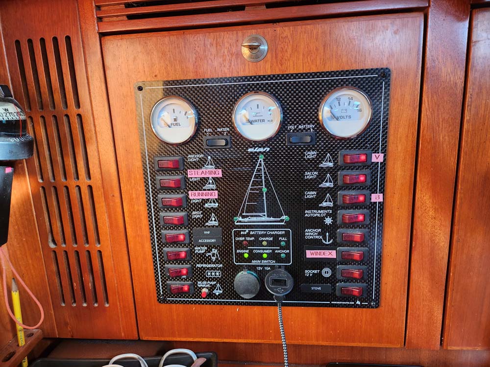 - Control panel with voltmeter for batteries, fresh water and fuel level indicator